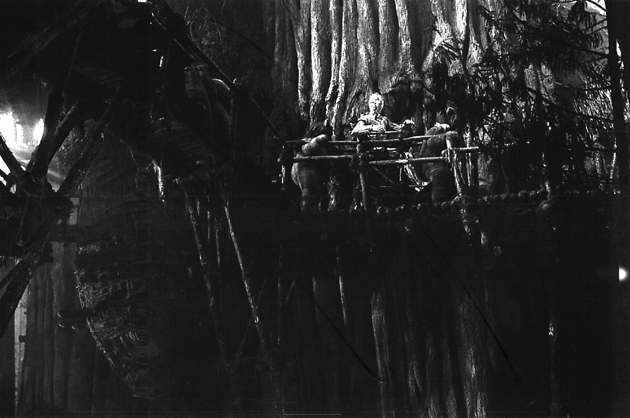 Atop a distinguished wooden throne, the cuddly Ewoks parade their "Golden God" Threepio into the heart of their treetop village, in this intriguing angle not quite seen in the finished version of RETURN OF THE JEDI.