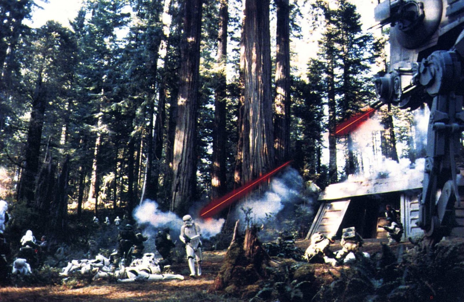 A classic image from RETURN OF THE JEDI used back in the day for publicity, and its certainly a great one too, showing all hell breaking loose as the Ewoks join the fight against the Empire. Lots to see in this shot: Rebel Commandos rushing to join Han at the bunker (one aiding him with cover fire), whilst others are wrestling with fallen Stormtroopers, there's an Imperial Commander racing off to the trees for safety, and in the far left corner a Speeder Bike pilot is readying for take speedy flight. To make the shot even more exciting, laser blasts would be painted onto the publicity image, emanating from the Scout Walker.