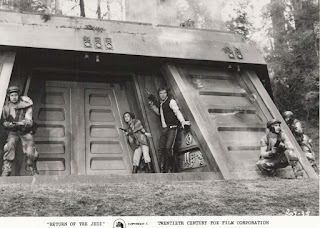 The shield bunker backdoor now firmly closed, Han Solo and Princess Leia, with a trio of battle-hardened Rebel Commandos, hold fire against the enemy, in this great photo composition from Return of the Jedi filmed on location in Southern California.